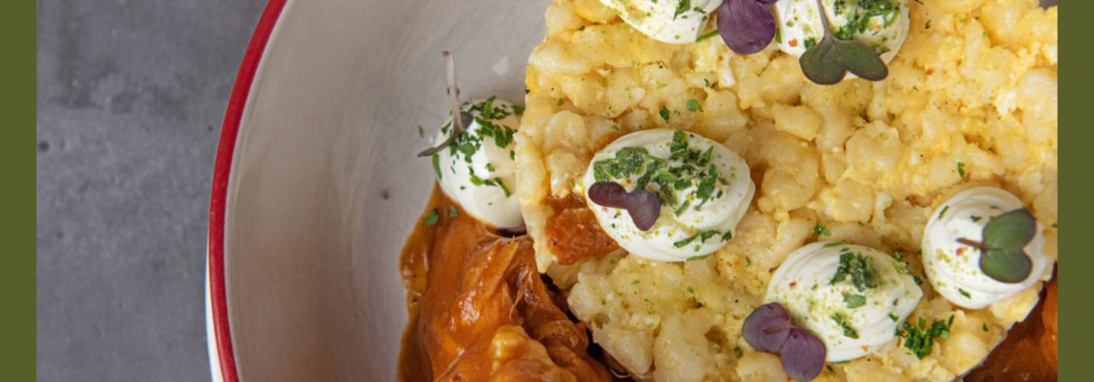 Borjúmáj roston zellerpürével, karamellizált almával és ropogós hagymával (+990.-)