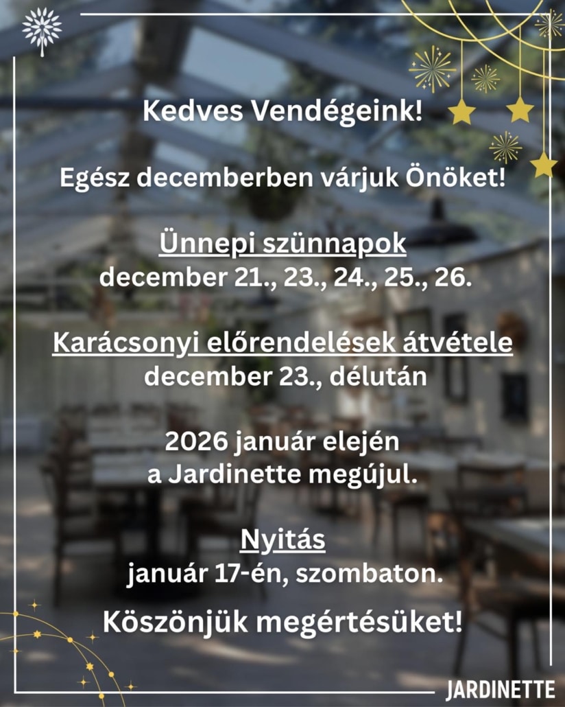 Ünnepi nyitvatartás https://jardinette.hu/wp-content/uploads/2025/11/IMG_0074-scaled.jpg 2560 1920 Étterem Üzletvezető https://jardinette.hu/wp-content/uploads/2025/11/logo_25evf_szines_fekvo_600-300x160.png Étterem Üzletvezető2025-12-20 10:07:252025-12-20 10:08:18Ünnepi nyitvatartás